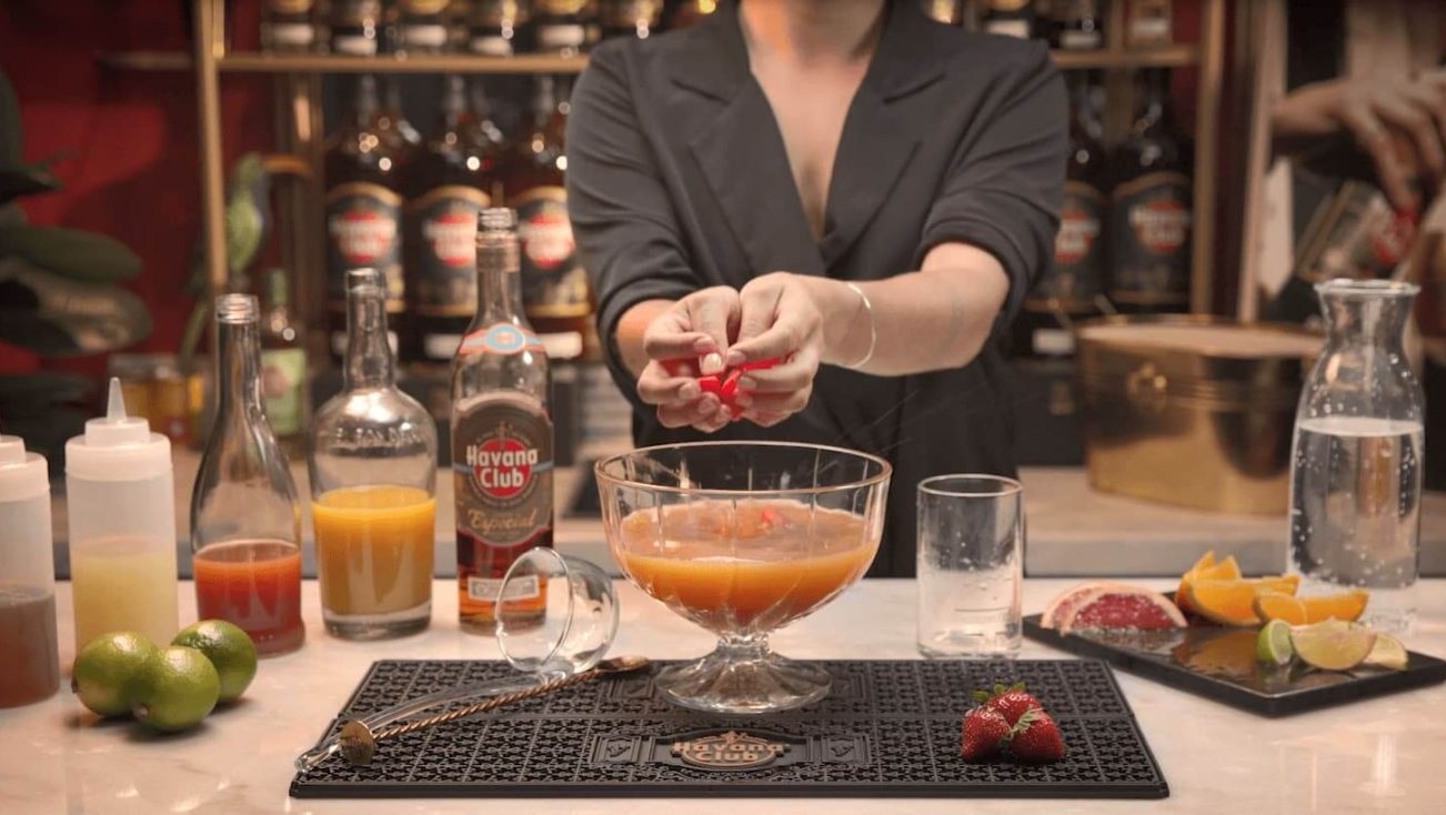 Giet de delen limoensap, sinaasappelsap, roze pompelmoessap en Havana Club Especial erin.